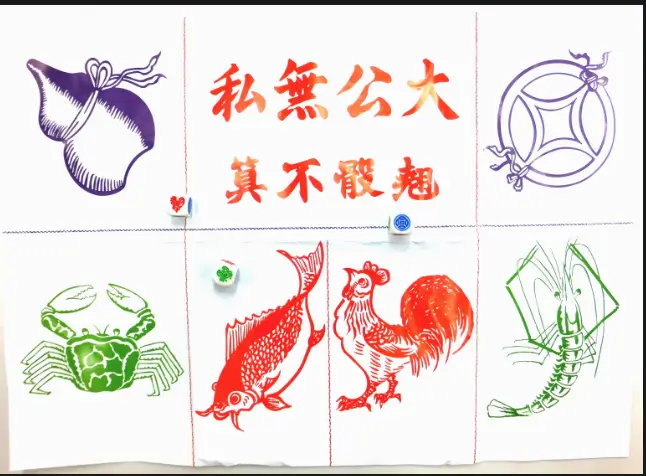 游戏使用三颗骰子,每面分别绘有六种象征吉祥的图案: